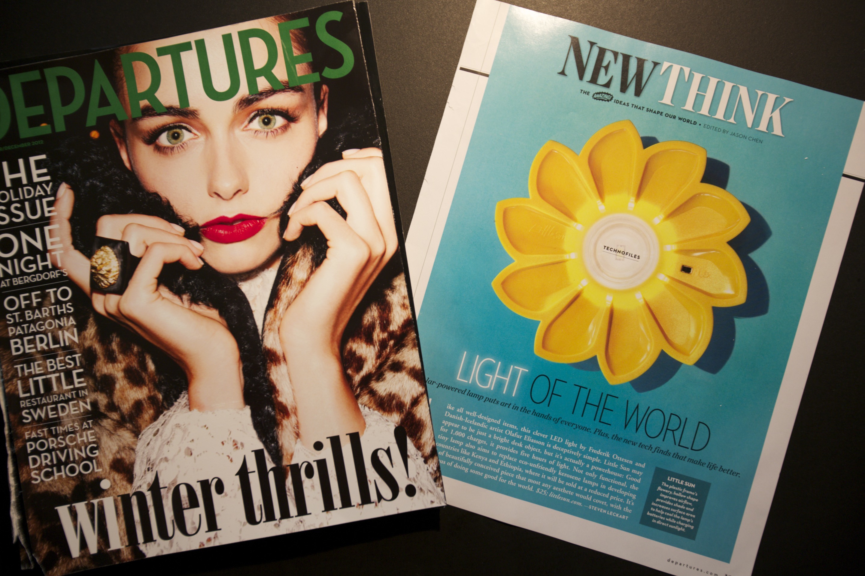 What brings recollection to this person to me at this point is opening up the latest magazine from American Express, the magazine named Departures, and inside see a one page image and small mentioning under the headline NEW THINK and LIGHT OF THE WORLD. It’s a mentioning of a little product called Little Sun. The guys behind the product is my old ninth grade fellow school kid, engineer Frederik Ottesen, who with Danish-Islandic Olafur Eliasson, have designed a little plastic flowery shaped rechargeable lamp, that is good for 1,000 charges and can help light up in homes or where ever you are (small enough to bring with you). Little Sun uses the natural energy of sunlight where energy is unavailable or unreliable, not affordable or not sustainable and thus a lot of the company of Little Sun’s efforts are taking this little lamp to people in dire need of it in third world countries while also aiding in greening the world with more eco-friendly solutions.